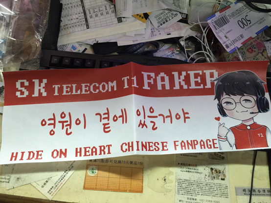 最後一場FW對上LCK最強隊伍,擁有三枚冠軍戒指的SKT,此時Faker的狂熱粉絲在現場發放自製的應援物,身為Faker腦粉的我當然迅速拿下以茲紀念。
